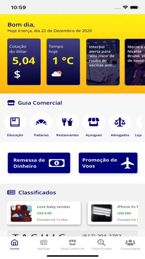 Já pensou ter a informação que você procura na palma da sua mão? Pesquisar lojas no Guia Comercial, anunciar nos Classificados, ver a cotação do dólar em tempo real e agora poder enviar dinheiro para o Brasil por PIX ou depósito bancário!