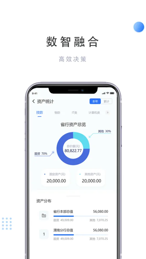 1、资产统计:实现了银行网点资产数据的统计和分析,为管理层提供可视化的数据看板,资产状况一目了然;