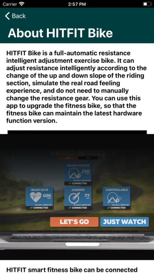 HITFIT Bike is a full-automatic resistance intelligent adjustment exercise bike. It can adjust resistance intelligently according to the change of the up and down slope of the riding section, simulate the real road feeling experience, and do not need to manually change the resistance gear. You can use this app to upgrade the fitness bike, so that the fitness bike can maintain the latest hardware function version.