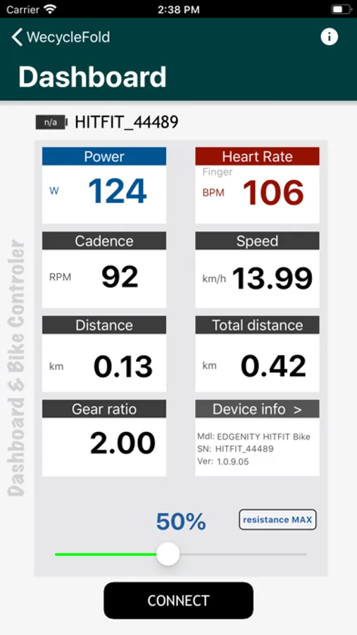 The dashboard allows you to connect to your bike's sensors via BLE, which displays data such as power, heart rate, cadence, speed, etc. The manual resistance control function is provided by the slider bar.