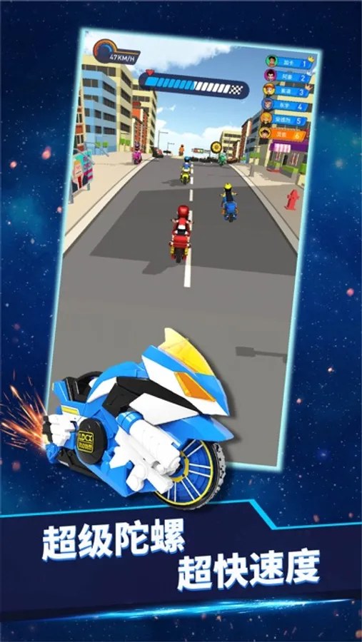 在竞速比赛过程中,你要留意避开路面的种种障碍,利用加速带瞬间提速,超越你的对手,同时还有各种好玩的道具等你来体验。别忘了升级你的摩托和陀螺,提高它们的性能,才能使你在游戏中更有胜算。另外,还有更多创新玩法即将开启哦。
