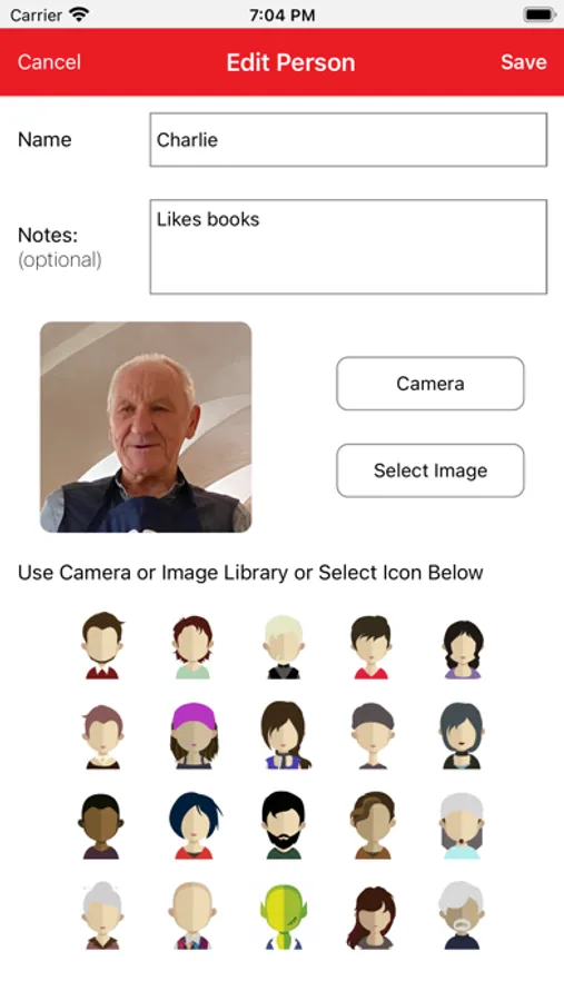 * Choose an image from your library or take one with your camera for each person, or select an avatar.