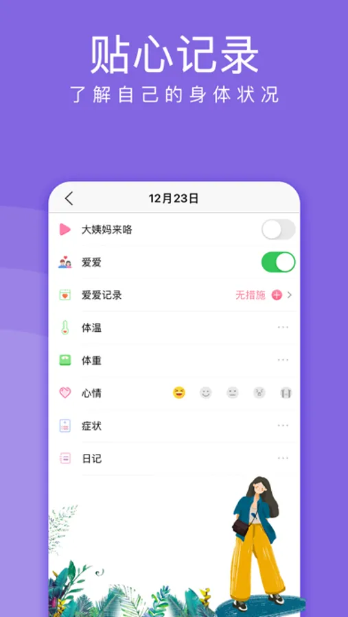 科学预测,细致地追踪,让你了解自己的经期状况;记录你每天的健康、心情,帮助你养成良好的生活习惯!