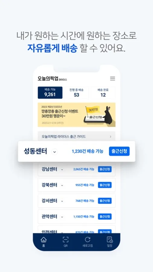 오늘의픽업 플렉스 라이더는 원하는 시간에, 원하는 배송지로, 원하는 수량을 선택해서 자유롭게 할 수 있는 배송 아르바이트입니다. 오늘의픽업 라이더스 앱 하나로 가입부터 배송, 수익 정산까지 한 번에 할 수 있습니다. 물류 허브 한 곳에서 한 번에 수거해서, 여러 건을, 가까운 곳으로 배송하여 최단 시간 내 최다 수익을 창출할 수 있습니다.