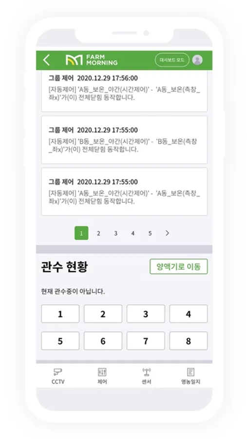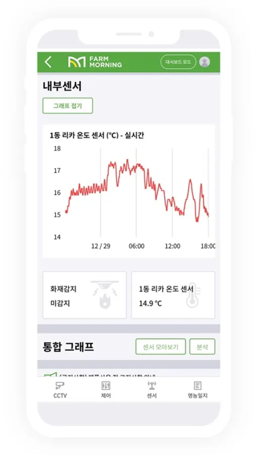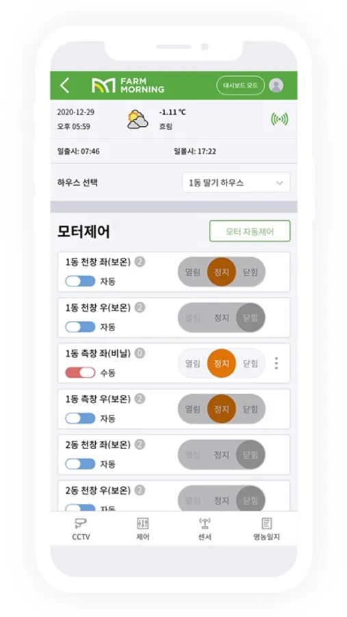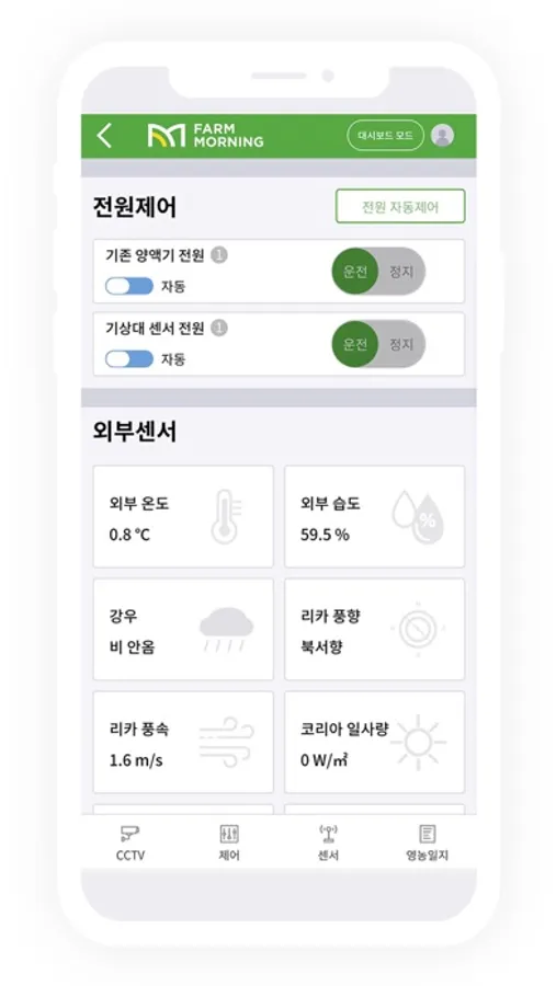 팜모닝 스마트팜 앱만 있으면 농장의 환경 뿐만 아니라 관수, 관비, 양액, 일사량 등 각종 시설을 스마트폰으로 간편하게 제어할 수 있습니다.