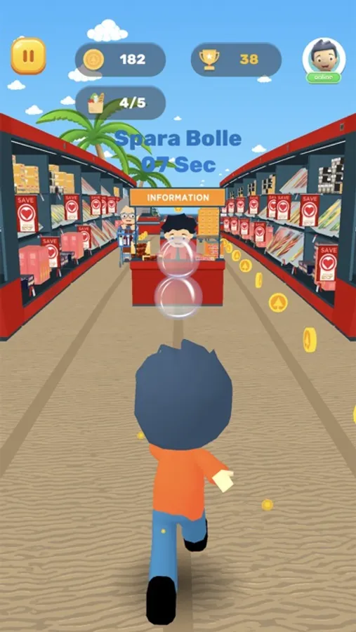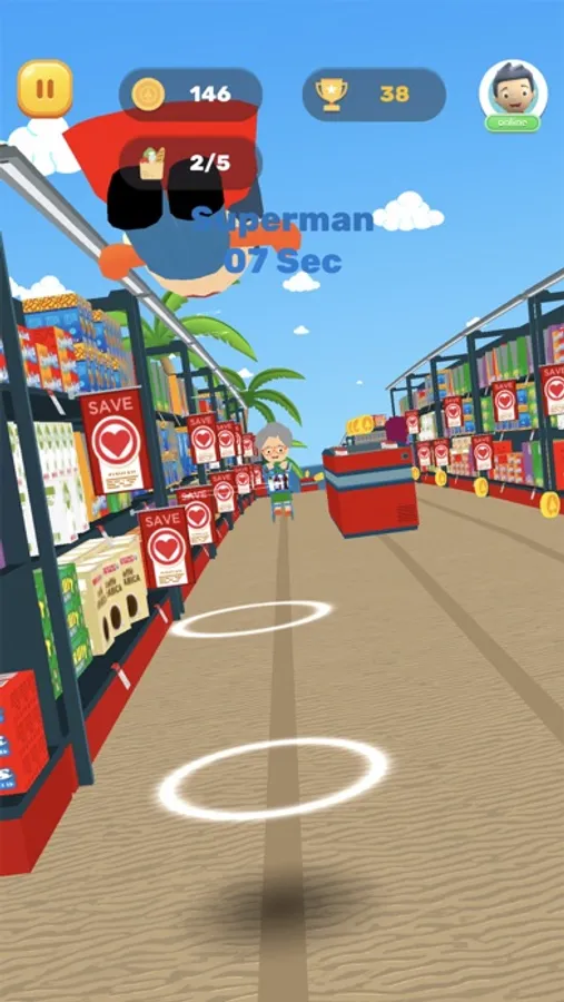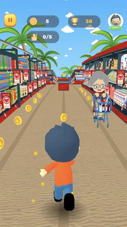 Corri in un immaginario supermercato, dove tra la sabbia fine e un cielo sempre blu, ci sono tanti scaffali pieni di prodotti! Raccogli tante monetine, schiva gli ostacoli e prendi i tanti bonus sparsi tra le corsie e... attento a non scontrarti con gli altri clienti!