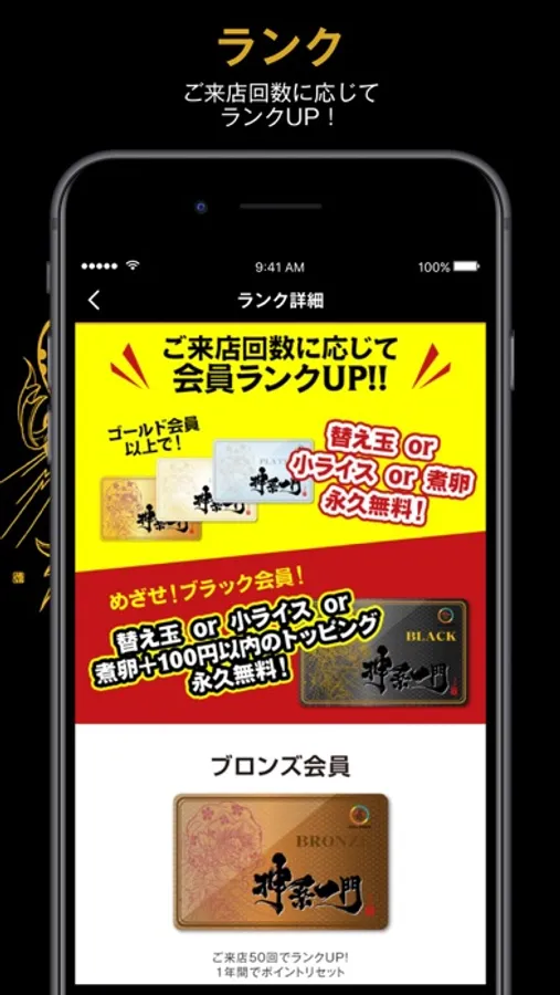 さらに、ブラック会員になると<替え玉 or 小ライス or 煮卵+100円以内のトッピング>永久無料!
