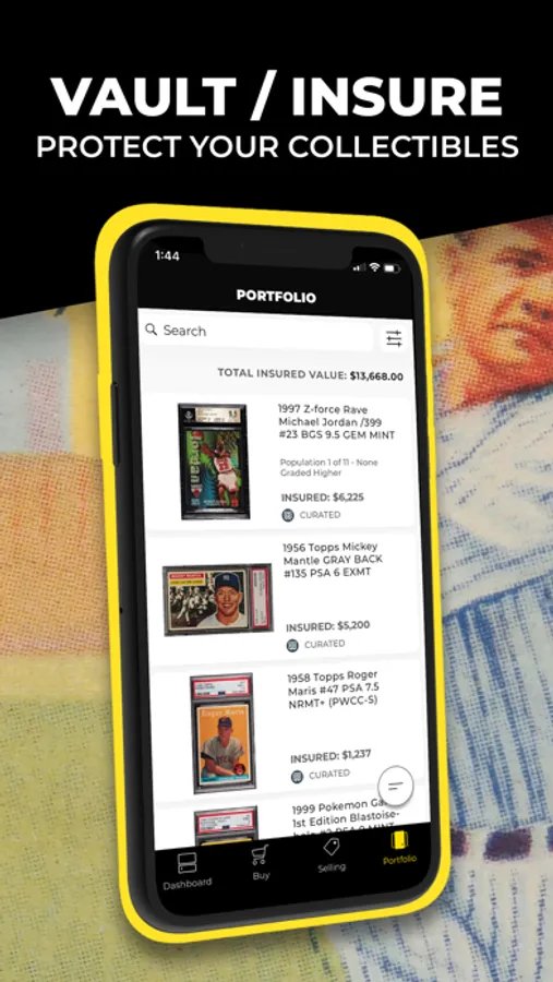 View your entire portfolio on your phone. All cards are listed in a fun and straightforward interface, including insured values for each card and a stated value of your entire vault portfolio.