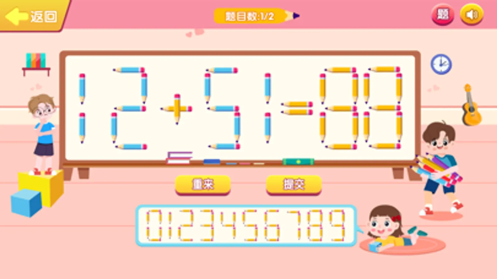 2.通过移动数字小棒为算式匹配正确的答案。训练学生的数感,将对数学口算的要求与游戏机制相结合,提高孩子的速度与正确率,告别枯燥练习,更有趣!