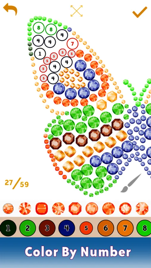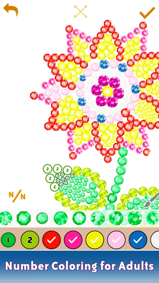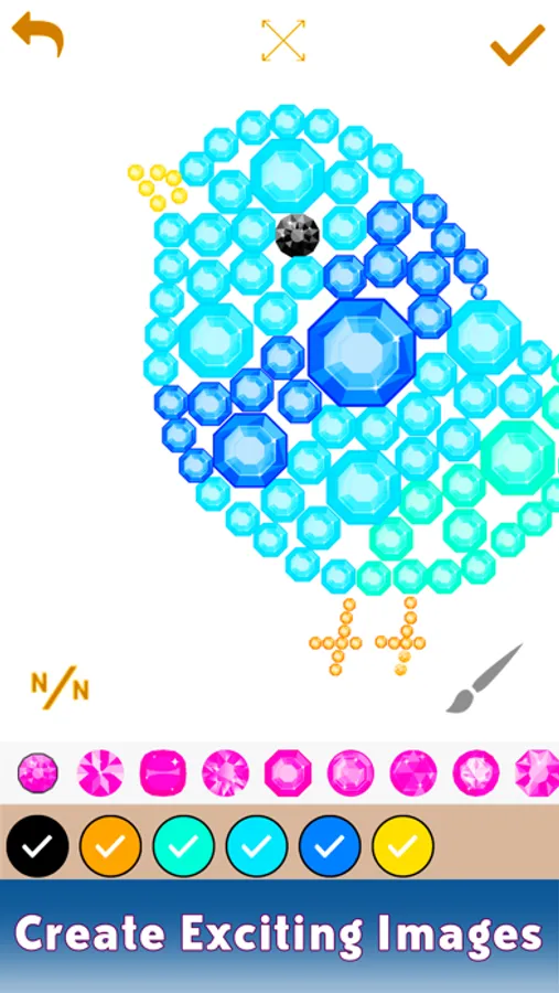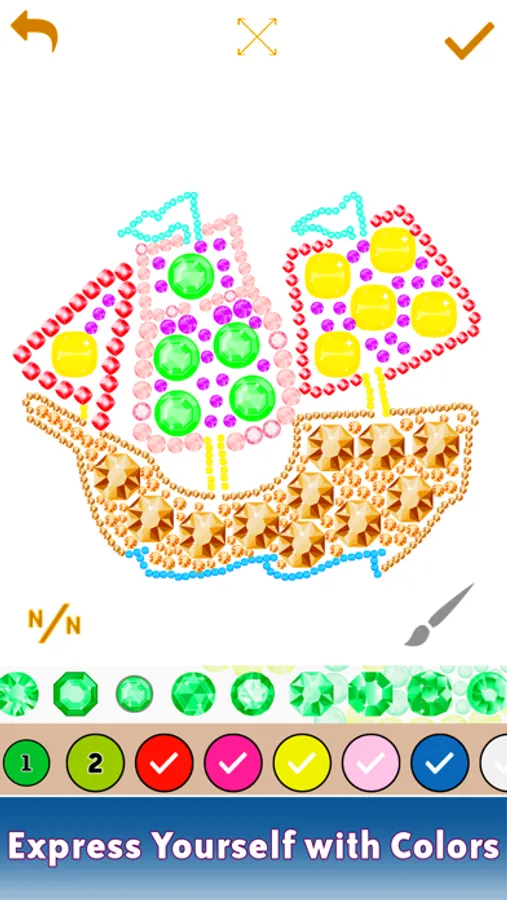 Diamond Art is a fun and relaxing coloring game that lets you create incredible button art style artworks with Tons of different materials: diamonds, gems, flowers, and much more. It's not just an excellent way to pass time but also an amazing design tool that will help you create pixel art masterpieces.