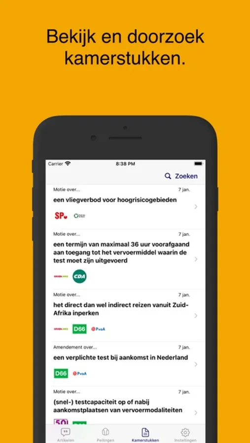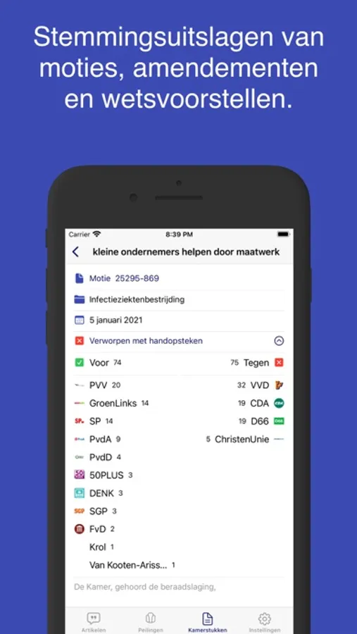 Bekijk de stemmingsuitslagen voor moties, amendementen en wetsvoorstellen.