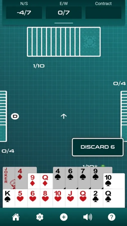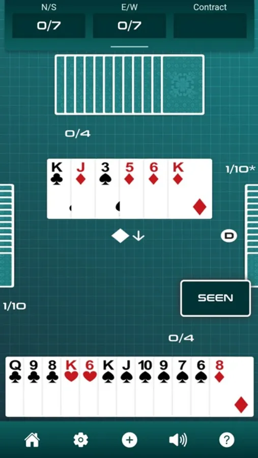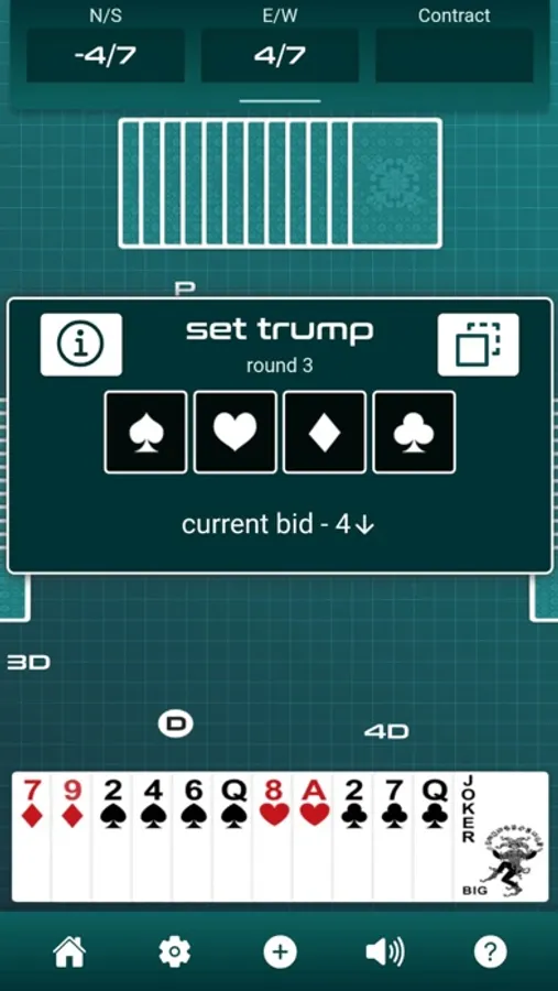 After the cards are dealt evenly between four players; the players, in turn, can pass or bid the number of books they believe their team can win above 6 (uptown for high cards, downtown for low cards or 'no trumps'). The winning bidder then decides which suit shall be trumps if an uptown/downtown bid was made, or which direction if a 'no trump' bid was made. The winning bidder then takes the kitty into their hand, which may be sported (turned face up) depending on your setting, and discards the number of cards contained in the kitty. The winning bidders are awarded the first book for taking the kitty.