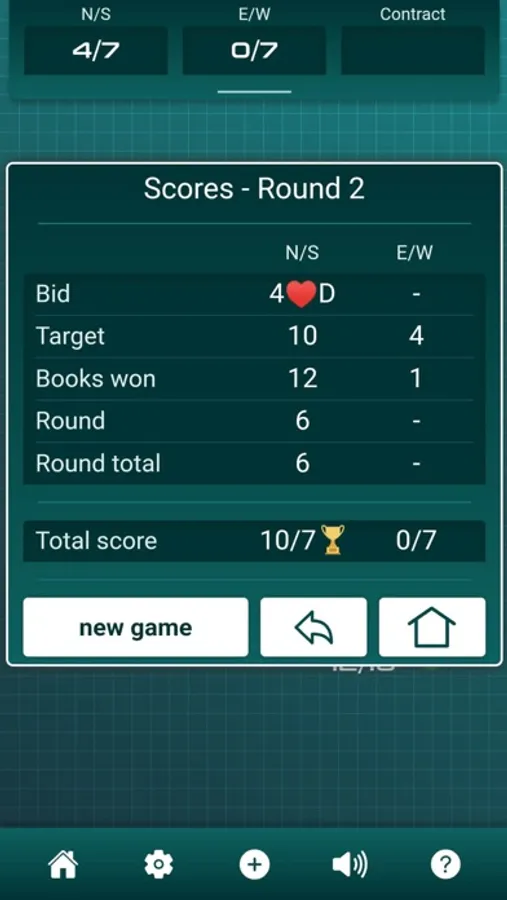 At the end of each round, the winning bidders score either 1 point for every book they won over six if they met or bettered their contract, or lose their bid size in points if they failed to make their contract. The game is won when the first team reaches the win target of 7, or forces the opponents to drop to or below -7.