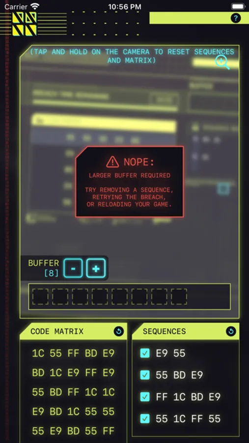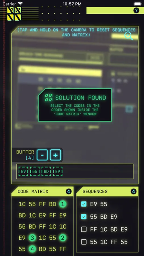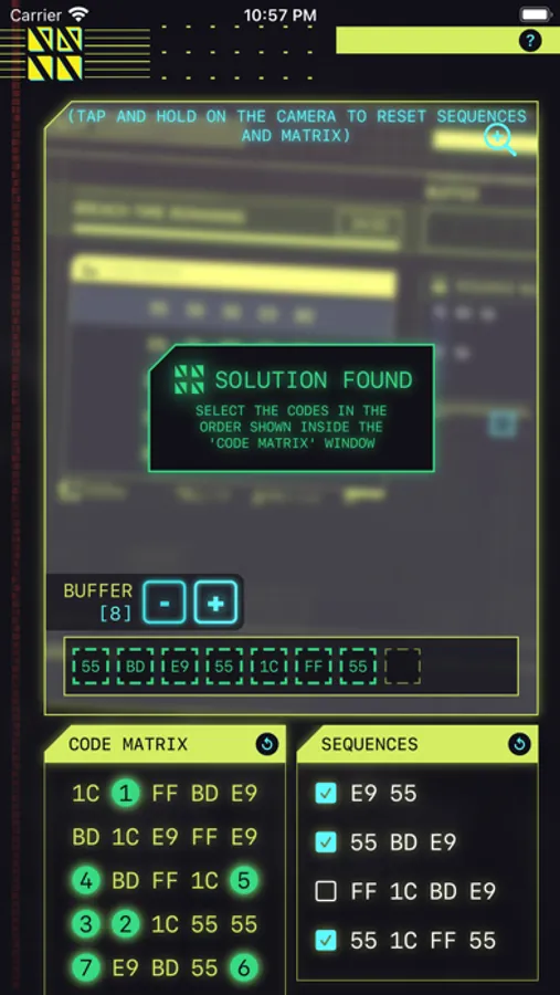 Uses your device's camera and on-device text recognition to read the matrix and sequences from the screen of your PC or console while you are performing a Breach Protocol hack in Cyberpunk 2077 and provide the best possible solution for your buffer size and selection of sequences.