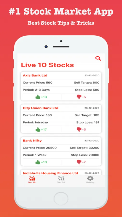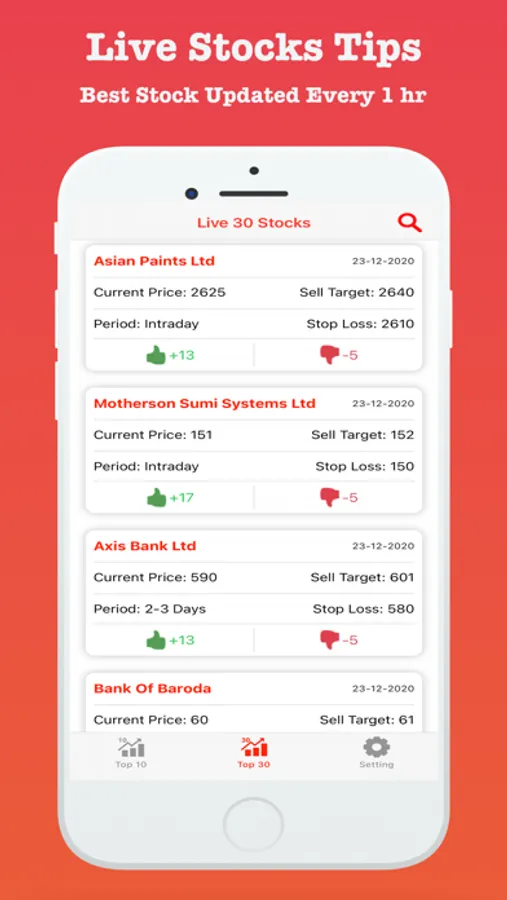 Users can see Target, Stop Loss, Period & Like Dislike and analyse the stock.