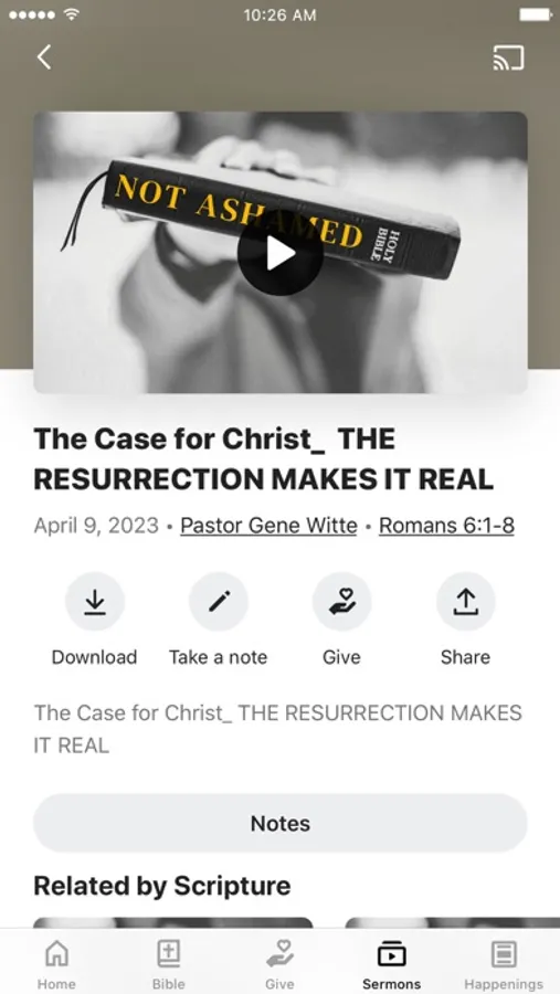This app will help you stay connected with the day-to-day life of our church. With this app you can: watch or listen to past messages; stay up to date with push notifications; share your favorite messages via Twitter, Facebook, or email; and download messages for offline listening.