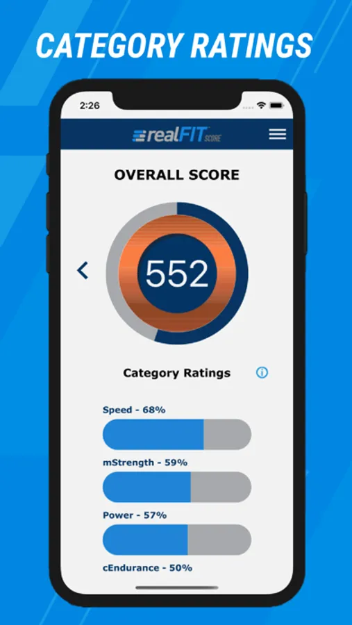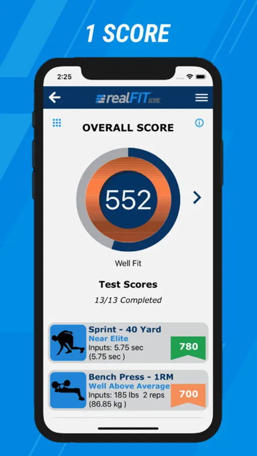 We provide a comprehensive assessment of your overall fitness level. Our scoring is based on absolute standards and specific procedures, and we instantly rate your performance on a scale from 0-1,000 for every test, as well as the overall score.