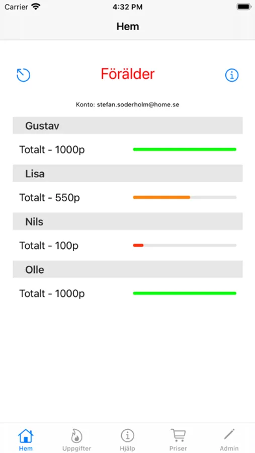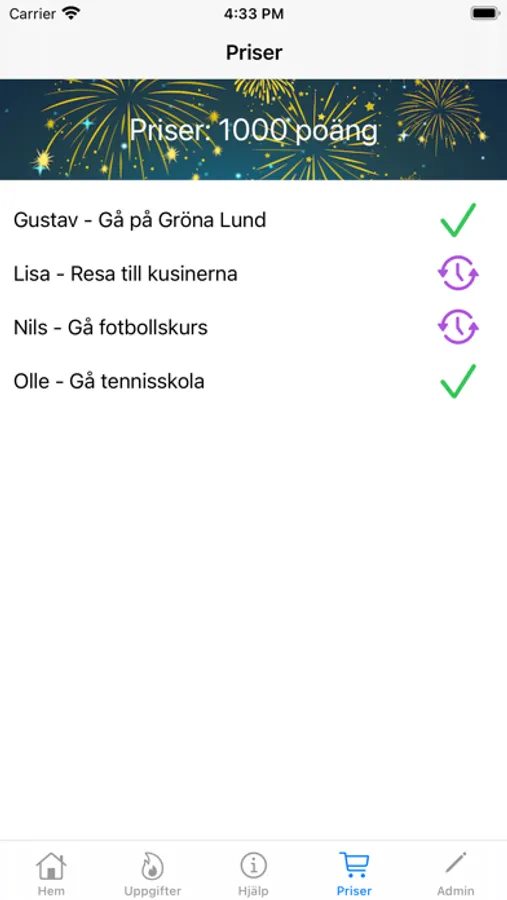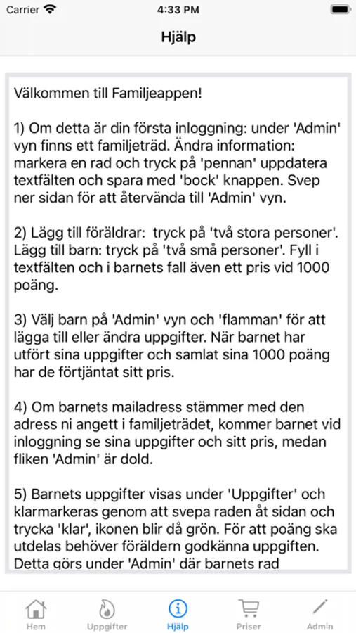 Gör tråkiga vardagssysslor till en poängsport där först till 1000 poäng vinner 1:a-priset, ett pris som barnen själva kan få bestämma. Tjäna poäng på att bädda sängen, gå ut med soporna, klippa gräset, kamma katten, sopa upp granbarren (det sistnämnda är oftast en syssla man kan tjäna poäng på året om av någon besynnerlig anledning) mm. Ni sätter själva vilka poäng som var och en av uppgifterna ger. Så ladda ner appen och få era barn att ge er ett skinande rent hem...eller en blank bil...eller iallafall fälla ner toalettlocket efter sig. Ni bestämmer själva.