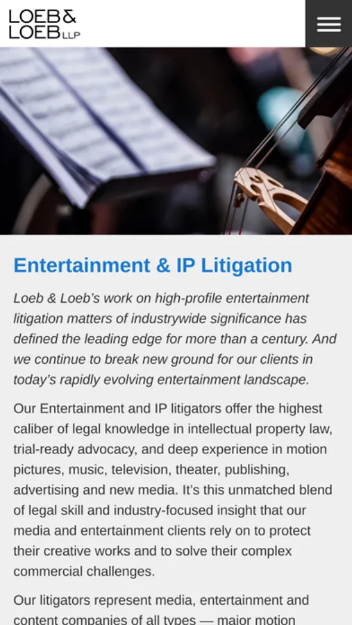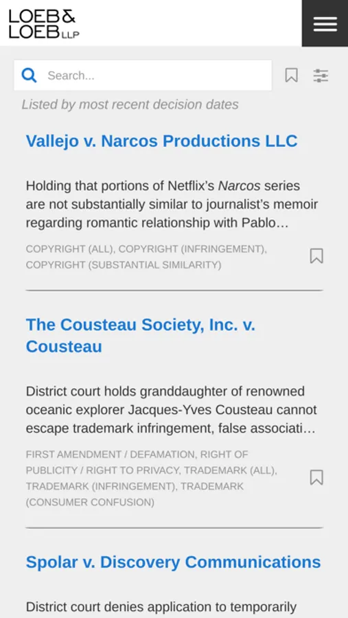 Loeb & Loeb's Intellectual Property/Entertainment Law Weekly Update covers cases of interest to content creators, owners and distributors across a wide range of intellectual property and entertainment-related legal issues. Our Knowledge Center includes more than a thousand searchable case summaries and downloadable case opinions, all accessible through this app. Cases are updated weekly.