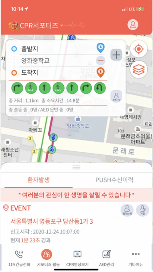 내 위치에서 심정지 환자 발생 위치까지 도보 최단경로를 탐색하여 제공합니다.
