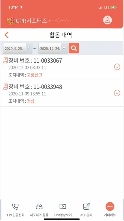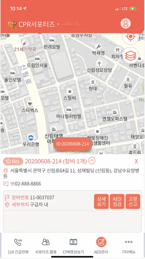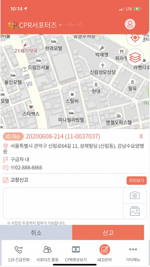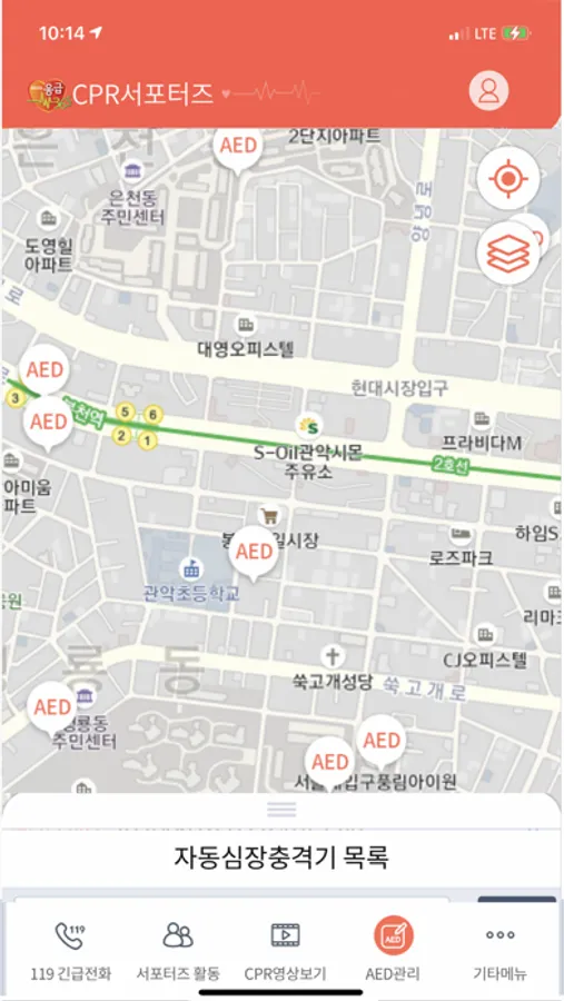 인근 AED의 위치 및 사용가능 여부를 제공하고, 고장 등 문제 발생을 신고할 수 있습니다.
