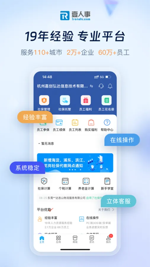 【壹人事平台】为企业提供:电子员工花名册、企业社保代缴、社保账户托管、薪资代发、电子工资条、员工福利、智能入职等产品和服务。