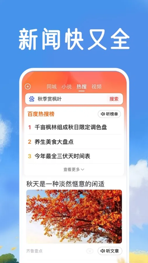 百度大字版,中老年朋友必备软件,视频资讯任意看,电台小说随心听,日常工具全都有,陪伴你度过温暖时光。