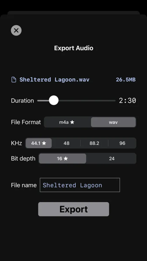 - Export a stereo audio file with your current settings, at sample rates up to 96KHz. On newer devices, exports occur faster than real time.