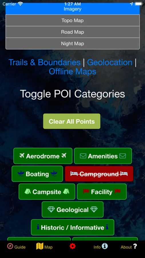 Once using the app, there are five screens. The Guide screen will provide data legends as well as helpful tips for optimizing your navigational experience. On the Info screen, you will find a number of spatial links to the different BLM properties. This is a great way to quickly locate specific places and discover new places to explore! The About screen provides links to all of the open-source resources used in the app and gives a little information about the developer GeoPOI. The Map Settings screen is where you can change between one of four different basemaps, download offline imagery, turn on geolocation, and toggle specific point categories. Finally, the Map screen is where it all comes together!