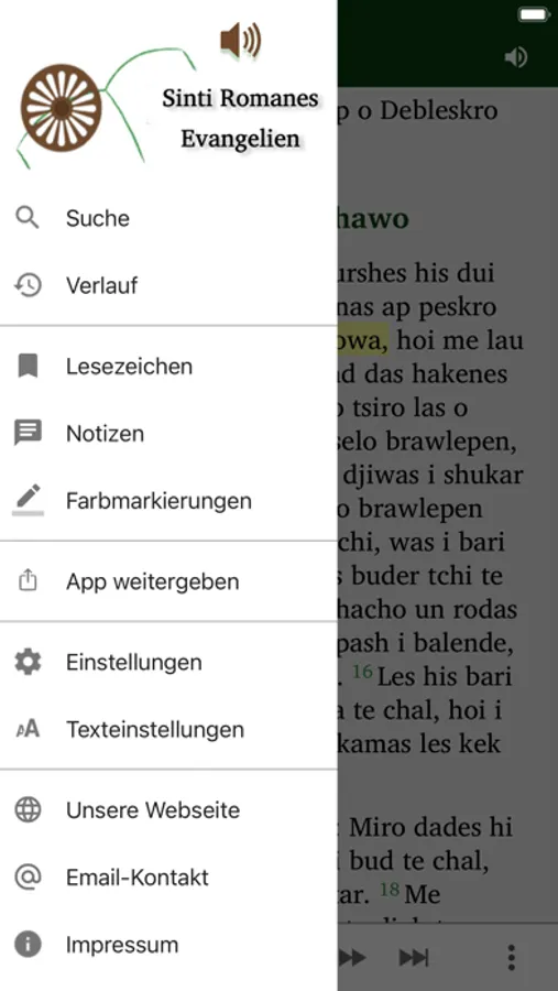 Diese App enthält die vier Evangelien aus der Romanes-Bibel im Sinti-Dialekt.