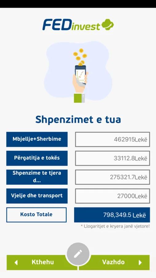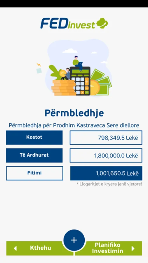 Një aplikacion celular që lejon fermerët të futen me lehtësi dhe të shikojnë koston dhe të ardhurat aktuale, si dhe të simulojë skenarët e ardhshëm për të bërë një investim në një sektor egzistues ose të ri.