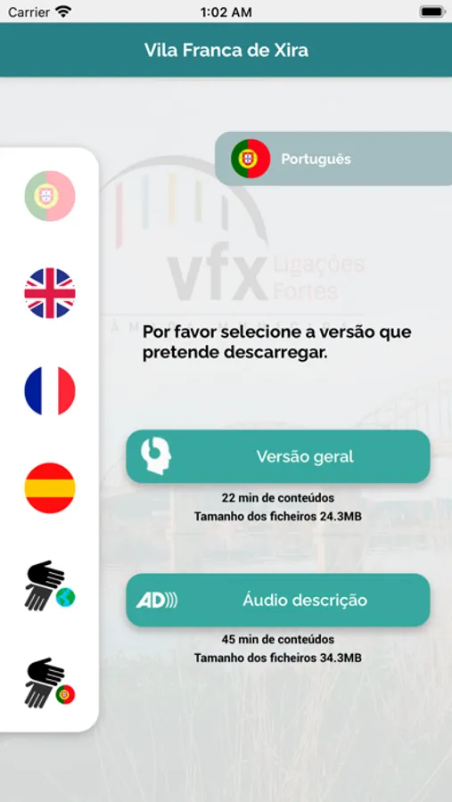 The app includes a multimedia guide with contents in 4 languages: English, Portuguese, French and Spanish.