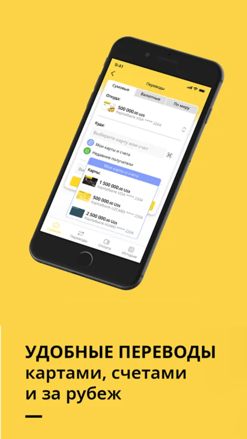 Вам доступны денежные переводы – в суммах и иностранной валюте, как внутри Узбекистана, так и международные. Между картами, счетами, в системах мгновенных переводов.