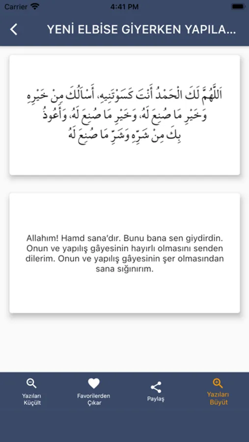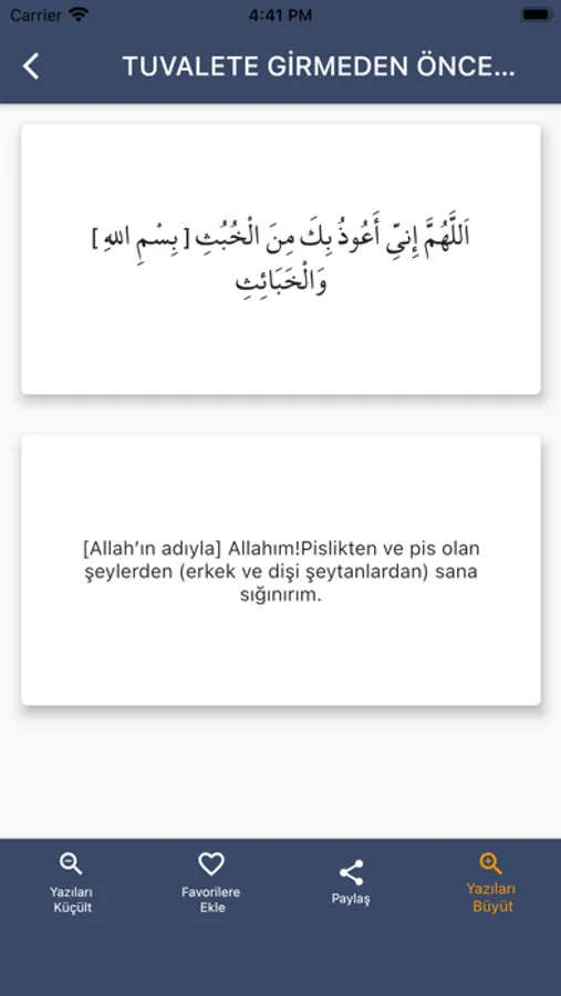 Günlük işlerimizi yapmadan önce ve sonra okuyabileceğimiz dualar ve zikirler bu uygulamada. Tuvalete girmeden önce ve sonra okunacak, Elbise giyerken ve çıkarırken hangisi okunmalı vb. yüzlercesi sizler için derlendi. Hemen indirin ezberlemeye başlayın. Ayrıca istediğiniz duaları favorilerinize ekleyip sonra tekrar bakabilir, istediğinizi herhangi platformda paylaşabilirsiniz.