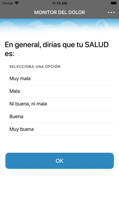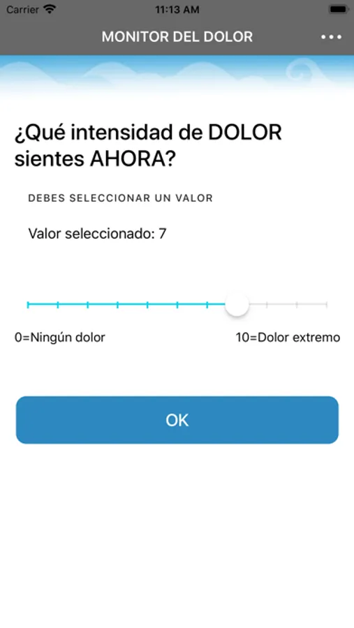Esta aplicación está destinada a investigar cómo influye el dolor en la vida diaria de las personas que sufren dolor crónico. Te preguntaremos diariamente (una vez por la mañana y otra por la tarde) unas breves preguntas relacionadas con el dolor (dolor, cansancio, estado de ánimo, etc). Sólo tardarás 2 minutos en contestarlas.
