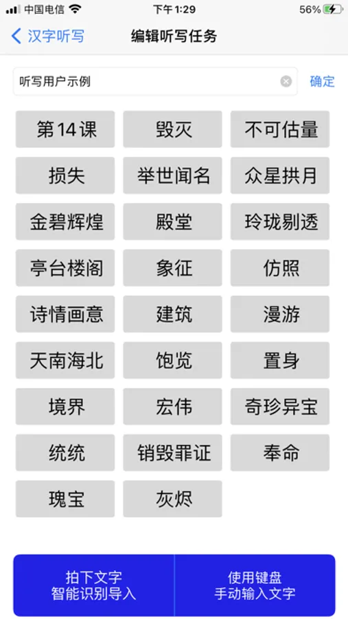 2、点击底部按钮“拍下文字智能识别导入”按钮,拍摄需要听写的文字