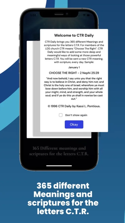 For members of the LDS church CTR means “Choose The Right”. CTR Daily would like to add some more deep and meaningful ways of looking at those powerful letters C.T.R. You will be sent a new CTR meaning, with scripture, every day. Sample: