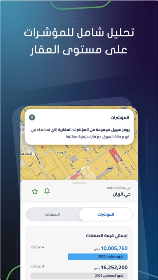 5- تحليلات عميقة لكافة الصفقات العقارية ل3.2 مليون عقار لعدد 3 مليون صفقة و تبلغ قيمتها 3 تريليون ريال سعودي