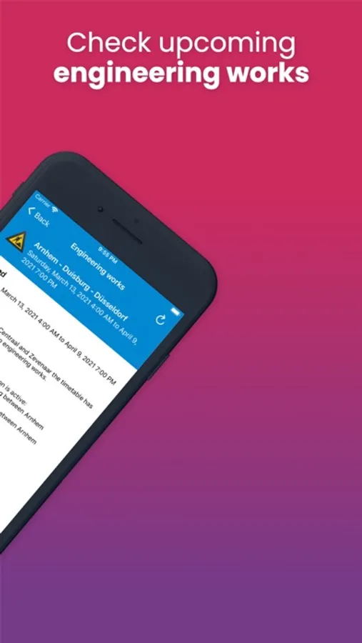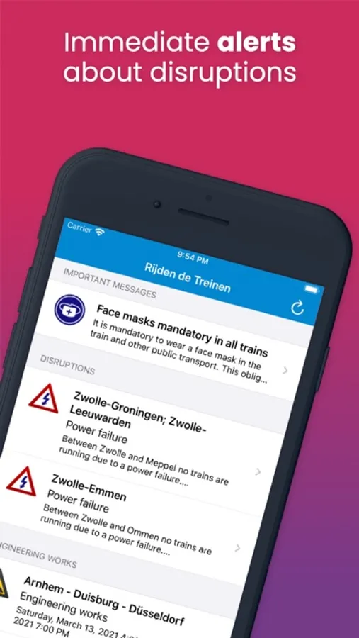 The app sends notifications about service disruptions. You can subscribe to service disruptions for your favorite railway lines, so you are notified timely about serious service disruptions on your daily commuter line. You can also choose to disable all notifications.