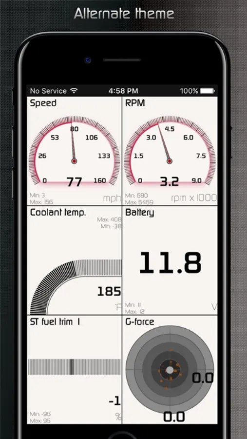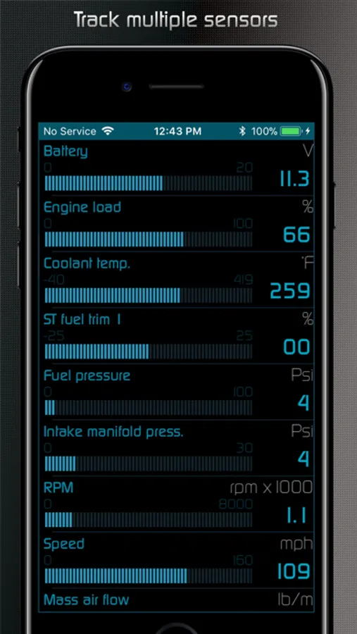 • Customizable gauges track up to 100 sensors in real time including fuel economy, G-force, gear display and battery voltage.
