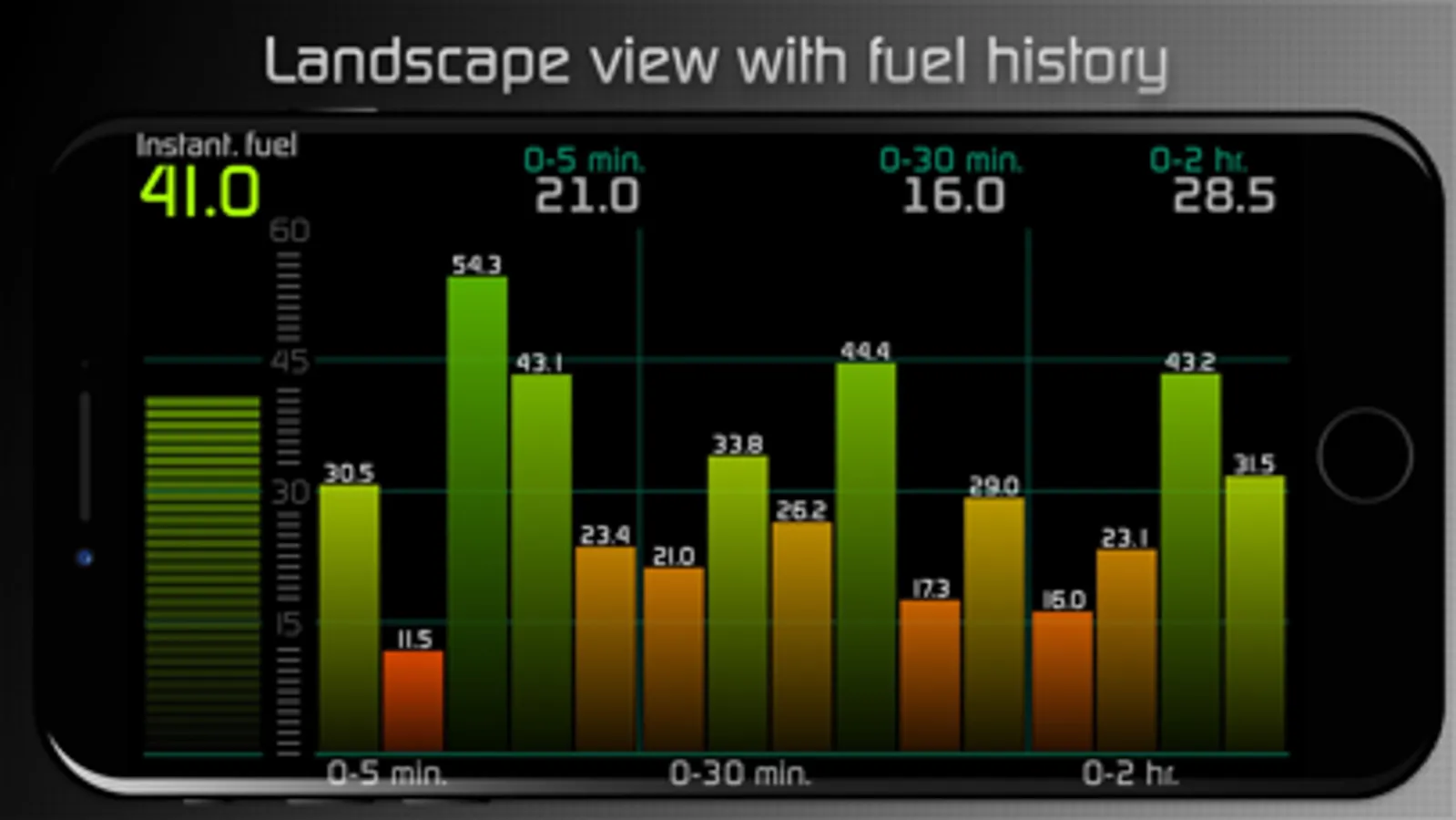 - Instant and average fuel economy tracking for 0-5 min, 0-30 min and 0-2 hr intervals and a detailed summary.