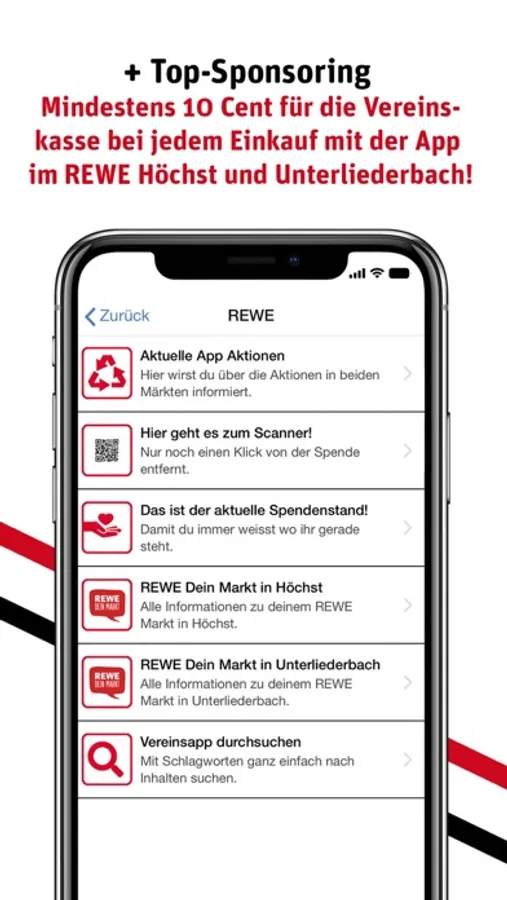 Mit der App kannst du den Verein, insbesondere die Jugendarbeit, unterstützen, indem du beim Einkauf im REWE Markt in Hoechst und in Unterliederbach mit dem integrierten Scanner den QR-Code an der Kasse scannst. Für jeden Scan spenden die Märkte mindestens 10 Cent an den Verein. Ohne zusätzliche Kosten und ohne Angabe persönlicher Daten!