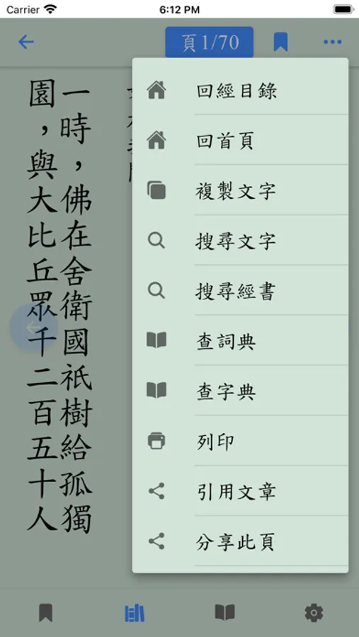 搜尋目錄、全文檢索、書籤功能、網址分享、離線瀏覽、語音播放、佛學詞典、佈景主題切換、經文分頁、字型調整、楷書字型、直排文字、列印經文/抄經本、無廣告、開放原始碼。