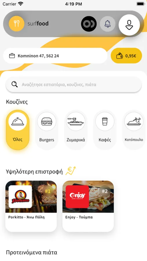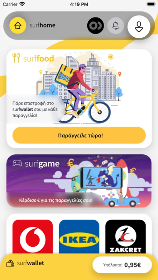 H νέα εφαρμογή delivery που σου επιστρέφει ευρώ μετά από κάθε αγορά! Τα ευρώ μαζεύονται στο πορτοφόλι του κάθε πελάτη και μπορεί να τα χρησιμοποιήσει όποτε αυτός θέλει σε μια επομένη αγορά του! Επίσης μπες στο Surf game παίξε το παιχνίδι& κέρδισε περισσότερα ευρώ στο πορτοφόλι σου! Και μην ξεχνάς τους καθημερινούς διαγωνισμούς με πλούσια δώρα από τις μεγαλύτερες εταιρίες IKEA, ZACKRET κλπ!