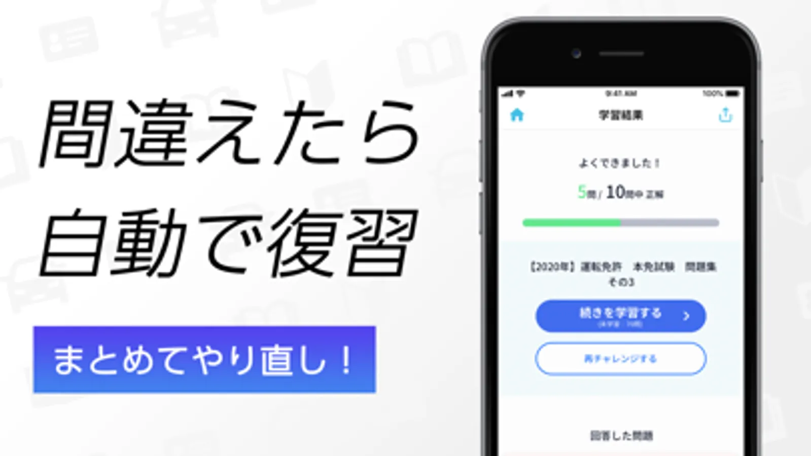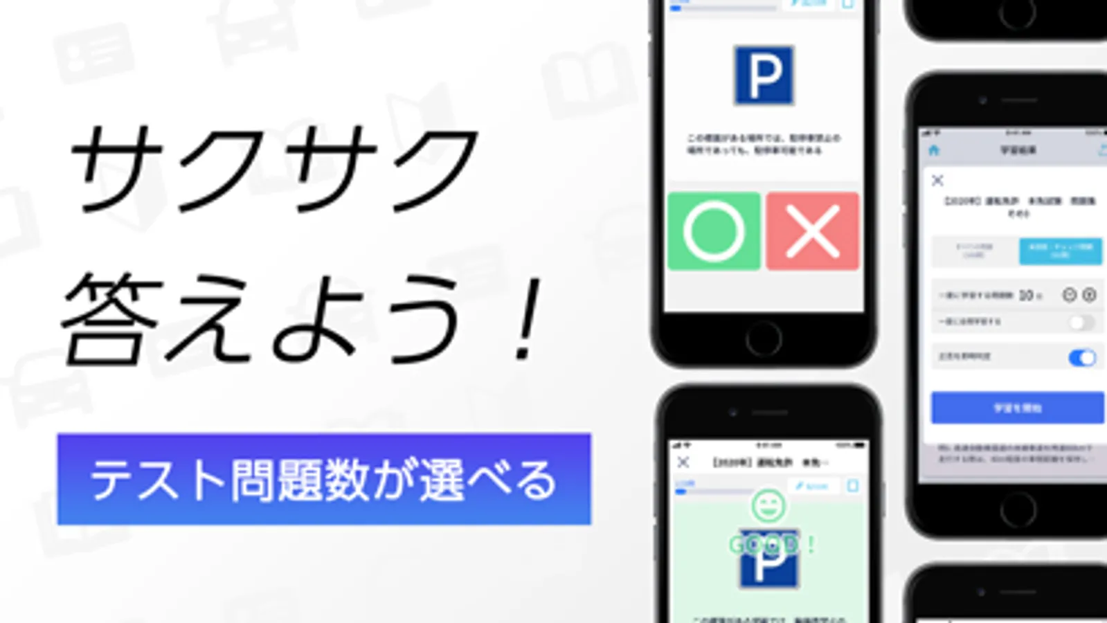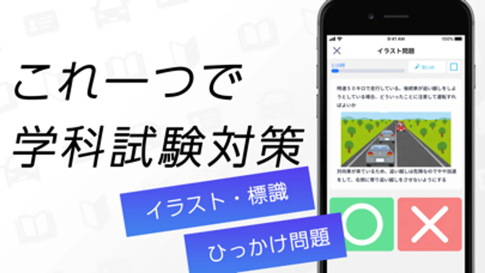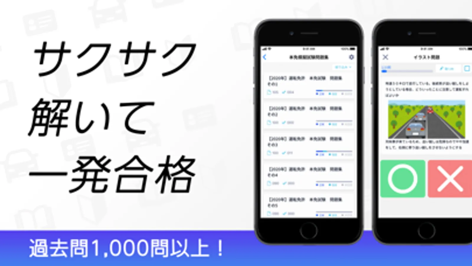 「運転免許 学科試験対策問題集」アプリは、自動車免許の学科試験や効果測定の過去問から、1,000問以上をまとめて学習できる問題集です。