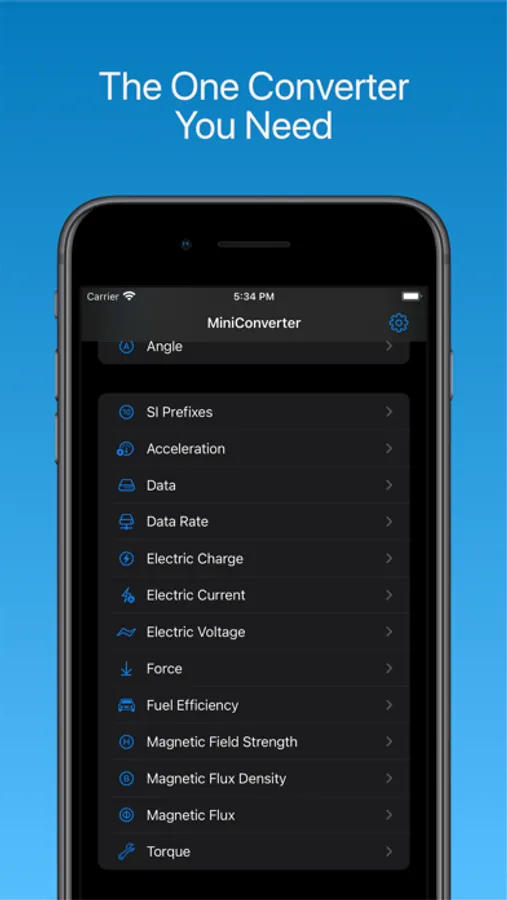 - Includes temperature, length, area, volume, speed, mass, time, pressure, energy, power, angle, SI prefixes, acceleration, data, data rate, force, electric charge, electric current, electric voltage, fuel efficiency, magnetic field strength, magnetic flux density, magnetic flux, and torque.