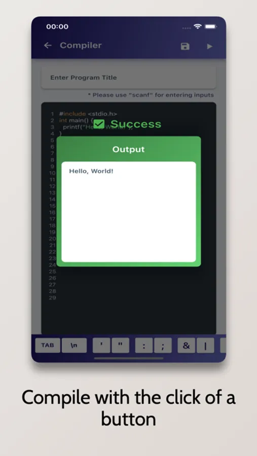 C Compiler is an Advanced IDE enabling you to compile C Programs on your Mobile Phone for Free. It comes with a code editor with in-built syntax highlighting capabilities.