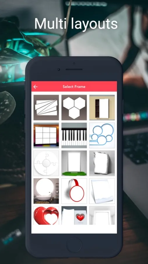 Large number of Layouts , Backgrounds , Filters and also you can add text, stickers and adjust border corner and radius.