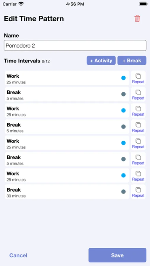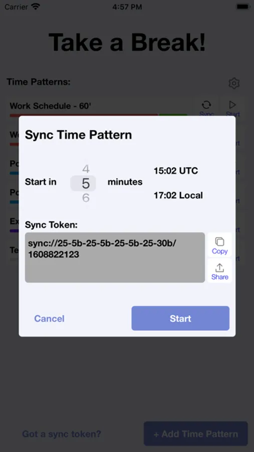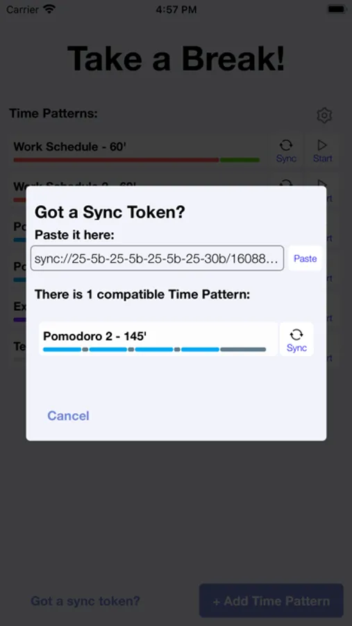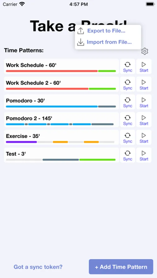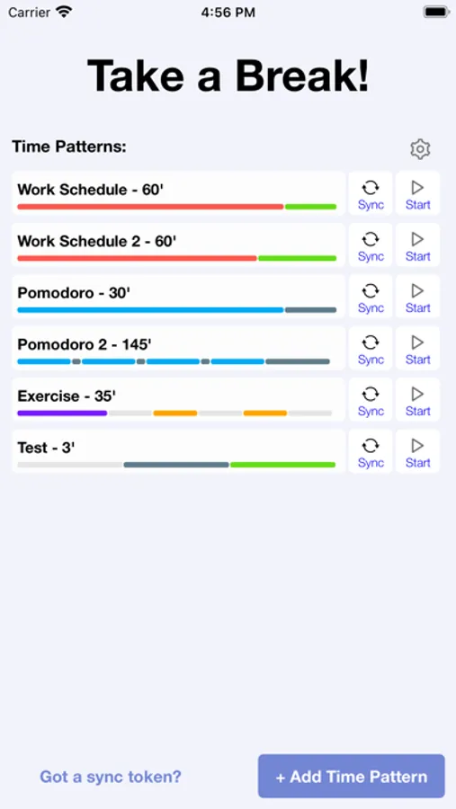 With Take a (sync) Break you can create custom work-break time patterns and be notified whenever it's time to take a break or resume work.