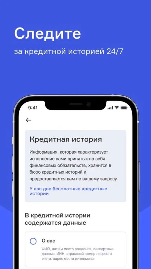 Получите свою кредитную историю за несколько минут. Контролируйте достоверность и своевременность данных после каждого важного события: получение и погашение кредита (займа), внесение платежей, направление заявки и т.д. Два отчета в год предоставляется бесплатно. Полученный отчет всегда доступен в истории запросов.